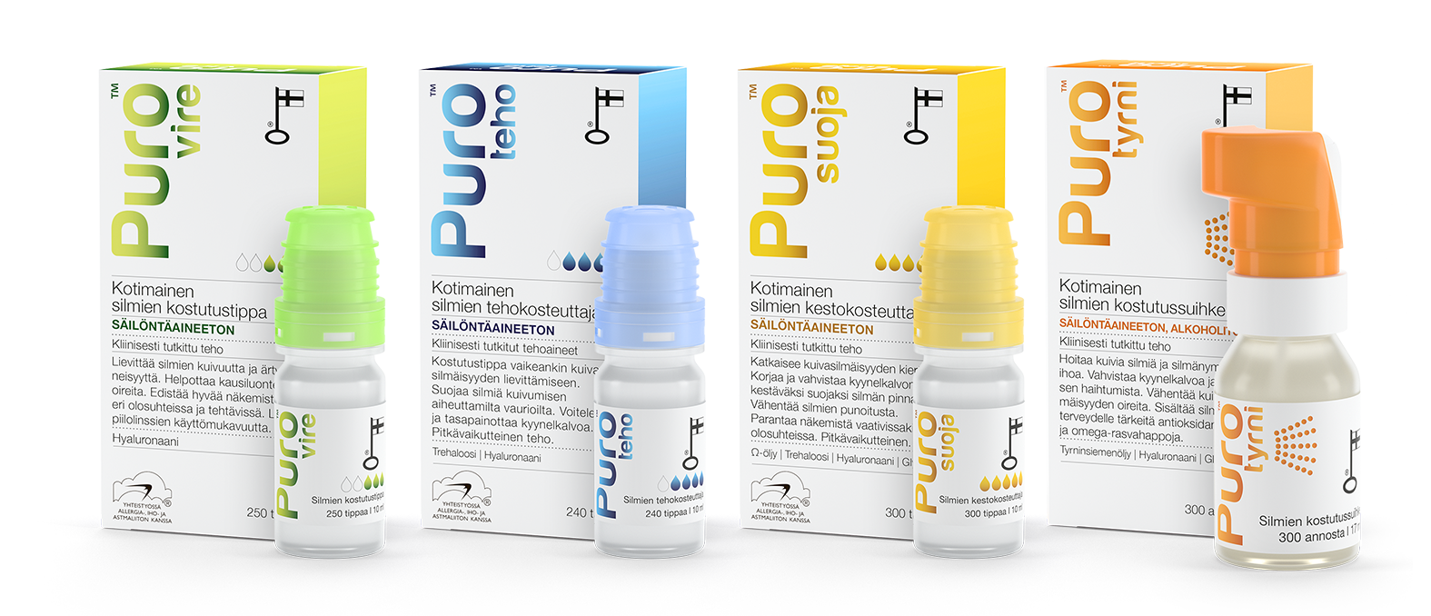 PuroSilmille® -tuotesarja on kotimainen kuivien silmien hoitoon tarkoitettu tuotesarja, joka sisältää 3 silmätippaa ja yhden silmäsuikeen kuivien silmien hoitoon.